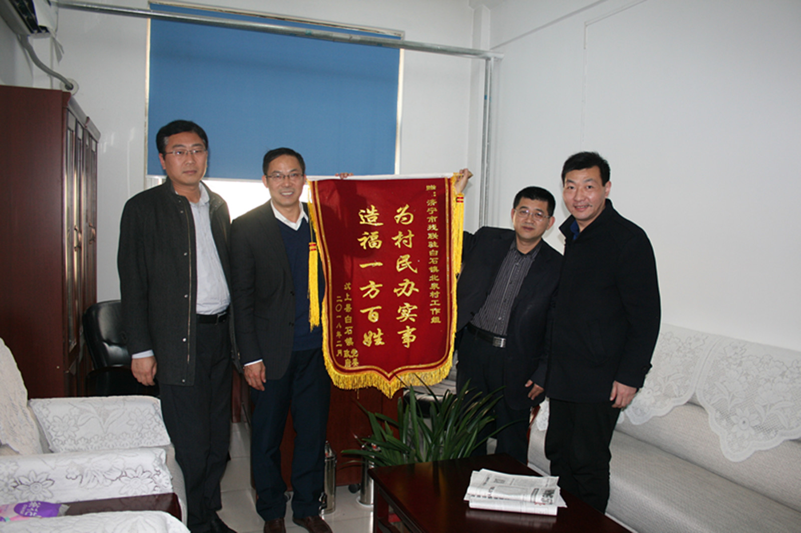 落实扶持村服务中心资金5万元,完成村服务中心修缮工程,为中心配备了会议室、办公室桌椅、空调、沙发、电脑、打印机等办公用品,有效保障了村各项活动开展,为村两委顺利换届选举奠定了场所基础,市委石光亮副书记到村现场指导调研村委换届工作,对第一书记工作成果予以充分肯定。将为农田机井配套项目列入两年度市派第一书记补助范围,争取市级农田水利资金10万元,完成了3处机井房屋建设,配置了水泵管线等。争取76万元配套项目支持,协助村完成新安装三台变压器,保障农田灌溉用电;完成村内4条道路3400米排水沟修缮工作。配合省革命老区乡村道路项目,完成新修道路3条,总长度4.9公里,为2018年度美丽乡村建设、昙山旅游综合开发奠定基础。2月13日,汶上县白石镇党委书记汪林、镇长宫庆帅、副书记王良东将一面“为村民办实事 造福一方百姓”锦旗送至市残联,以此表达对市残联真情帮扶的诚挚谢意。